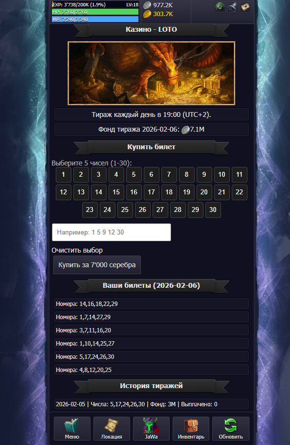 Билеты LOTO отображаются в инвентаре как расходники с данными о тираже и номерах.